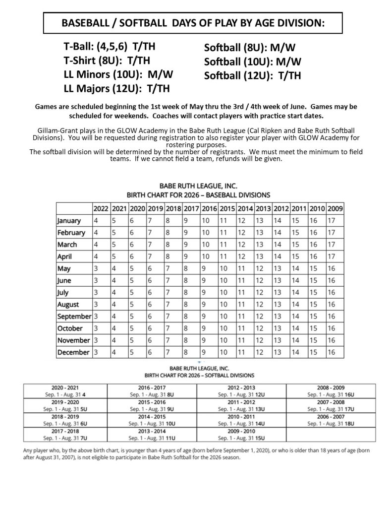 - T-Ball: ages 4 to 6 (must be 4 by November 30 of the previous year)